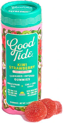 Lean into relaxation and recovery with Good Tide Kiwi Strawberry THC:CBD:CBG gummies. Hybrid single-strain rosin along with an extra boost of CBG are wrapped up with juicy kiwi strawberry flavors to help you fully reset.