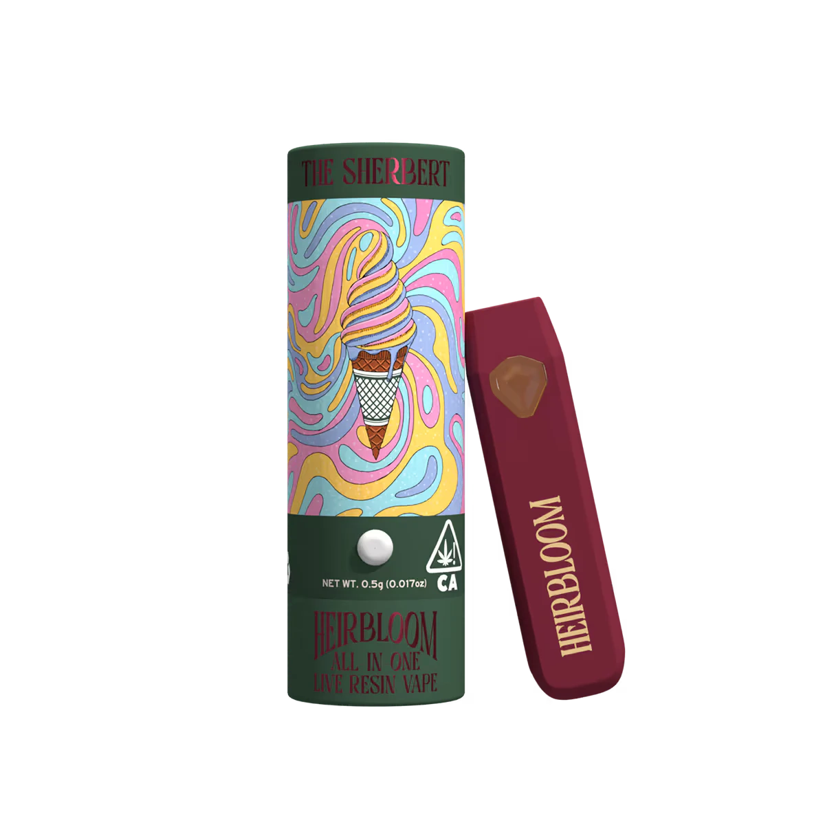 The Sherbert — also known as Sunset Sherbert — is one of the most influential dessert strains in modern cannabis history. Bred in 2014 by Bay Area icons Mario Sherbinski and Jigga of Cookie Fam, these seeds laid the foundation for the creation of Gelato and ultimately the entire “exotics” wave that dominates today’s market. In this 0.5g rechargeable all-in-one vape, Heirbloom captures the cultivar’s signature terpene profile: fruity sweetness, tangy citrus, creamy candy-like notes, and a smooth dessert finish. The experience is flavorful, rich, and unmistakably Sherb — a true classic preserved in its purest form. The effects strike a beautiful balance of uplifted mood, creative energy, and blissful full-body relaxation, making this hybrid ideal for late afternoons, early evenings, or anytime you want smooth, feel-good vibes. About Heirbloom: Heirbloom Legacy Flower preserves historic cannabis genetics and honors the cultivars that shaped today’s cannabis culture. Their all-in-one vaporizers deliver clean, terp-rich expressions of iconic heirloom strains, refined through generations of cultivation expertise.