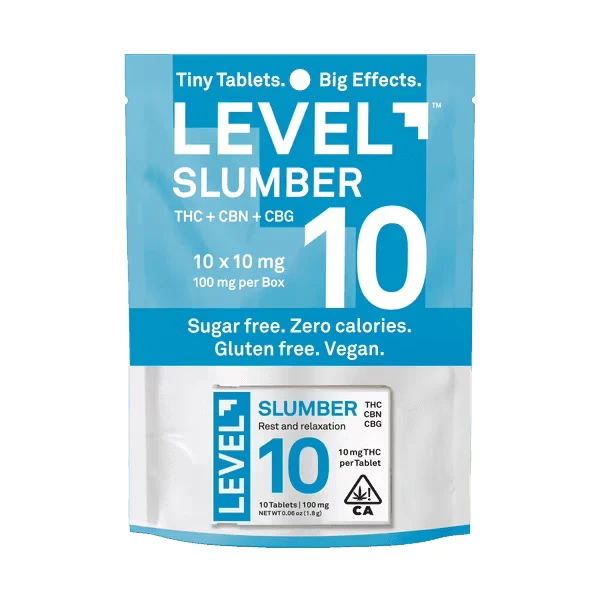 Struggling to find a natural and effective way to unwind and get a good night's sleep? Then forget sugary gummies and late-night snacks and try LEVEL 10 Slumber. We've combined the power of 10 mg of delta-9 THC, 5 mg of CBN, and 3 mg CBG in a carefully balanced formula designed to gently lull you into a state of relaxation and promote restful sleep. These highly effective, long-lasting tablets are sugar-free, gluten- free, vegan, and contain zero calories. They're scored for easy splitting so you can customize your dose to find the perfect level of tranquility. Simply swallow with liquid.