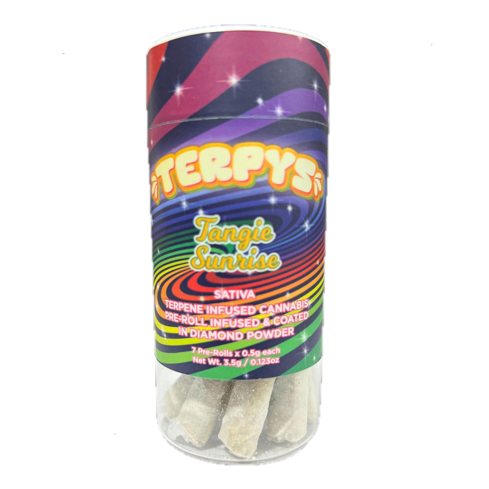 Tangie Sunrise by Terpys is a terpene-infused, diamond-coated pre-roll pack crafted for bold flavor and elevated potency. Each joint is coated in premium diamond powder and crumble, delivering a smooth, terpene-rich experience with every pull.