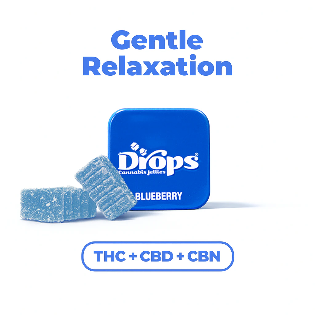 Drops Gentle Relaxation Blueberry Live Rosin Jellies blend strain-specific live rosin from GMO × Legend OG with added CBD and CBN for a calming, full-spectrum experience. Each jelly delivers a powerful yet soothing entourage effect—anchored by CBD for body ease, CBN for restful tranquility, and THC for enhanced mood and comfort. Formulated for winding down without heavy sedation, this balanced trio promotes gentle relaxation, quiet clarity, and serene well-being. The juicy natural blueberry flavor adds a fruity sweetness to every bite.