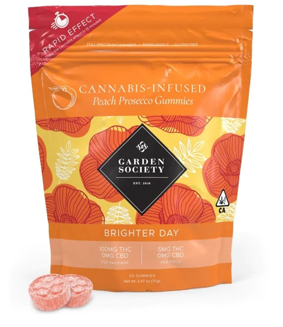 Garden Society Peach Prosecco gummies are inspired by the delicious flavors of wine country, and will have you feeling bubbly and joy-filled. Your taste buds will be dancing with juicy flavors of a ripe summer peach, complemented by the sparkling, fruity flavors of Prosecco. Made with uncompromising quality ingredients. Using Proprietary, Fast-Acting Technology, Full Spectrum edibles will provide a desired effect in around 15 minutes.