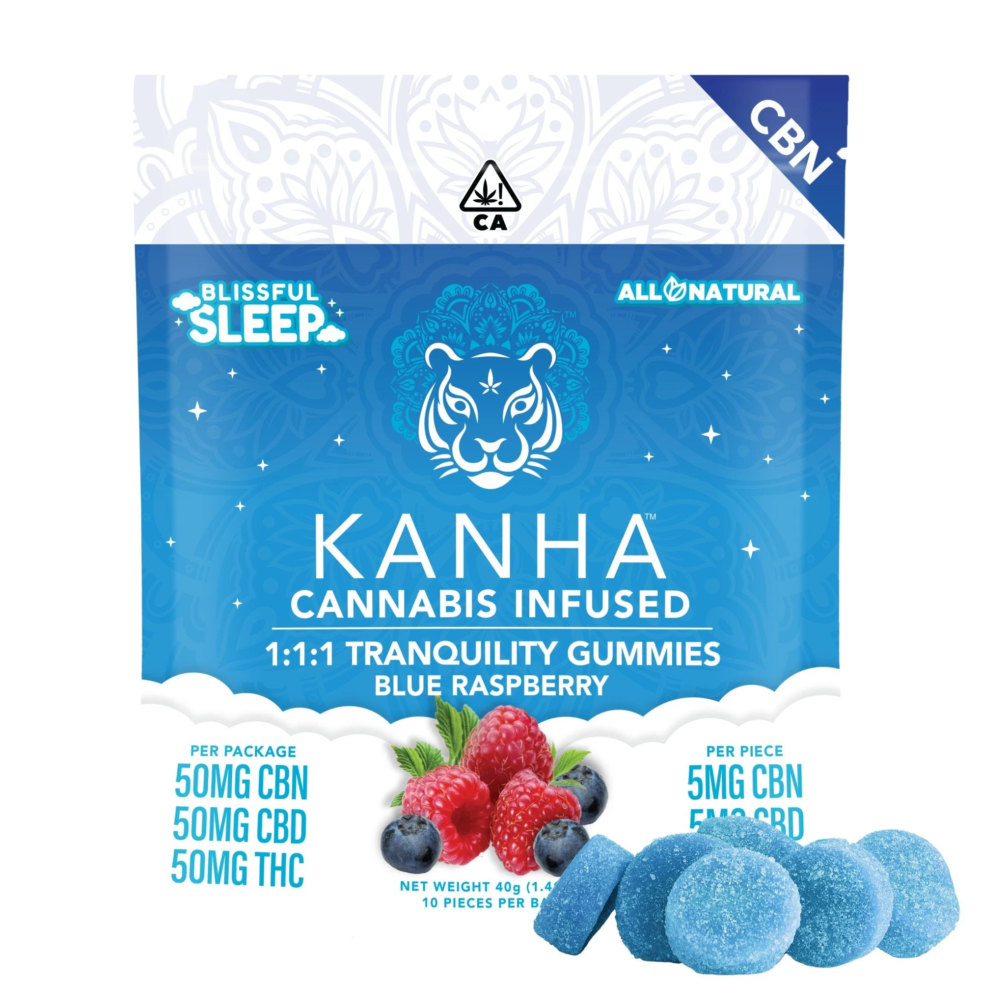 Kanha Sleep Tranquility Blue Raspberry Gummies are designed to guide you gently into restorative rest with a precise balance of cannabinoids. Each gummy contains 5mg CBN, 5mg CBD, and 5mg THC, creating a 1:1:1 ratio that promotes relaxation, eases stress, and supports deeper, longer sleep. Infused with calming terpenes like β-caryophyllene and myrcene, this synergistic blend enhances the entourage effect for a more effective nighttime experience. Bursting with nostalgic blue raspberry flavor, these gummies are a delicious way to end your day and drift off naturally. With 50mg of each cannabinoid per pouch, Tranquility Sleep offers consistency, flavor, and the trusted Kanha quality that sets the standard in cannabis edibles.