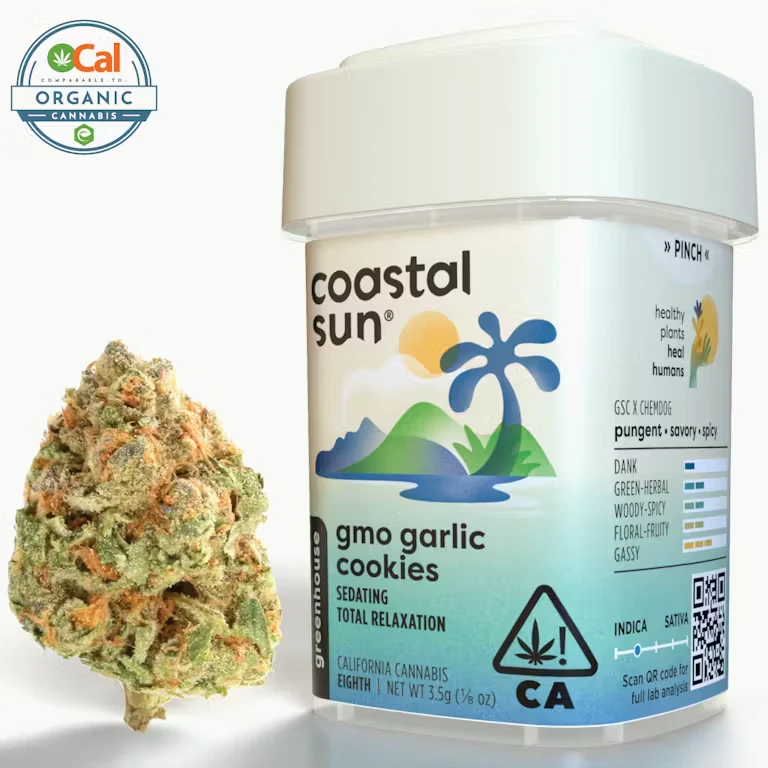 GMO Garlic Cookies showcases the deeply savory side of Coastal Sun’s regeneratively farmed, nutrient-rich flower lineup. This extra-funky phenotype leans hard into classic GMO character, delivering pungent garlic, earthy mushroom, and onion-forward aromas that live up to the name.