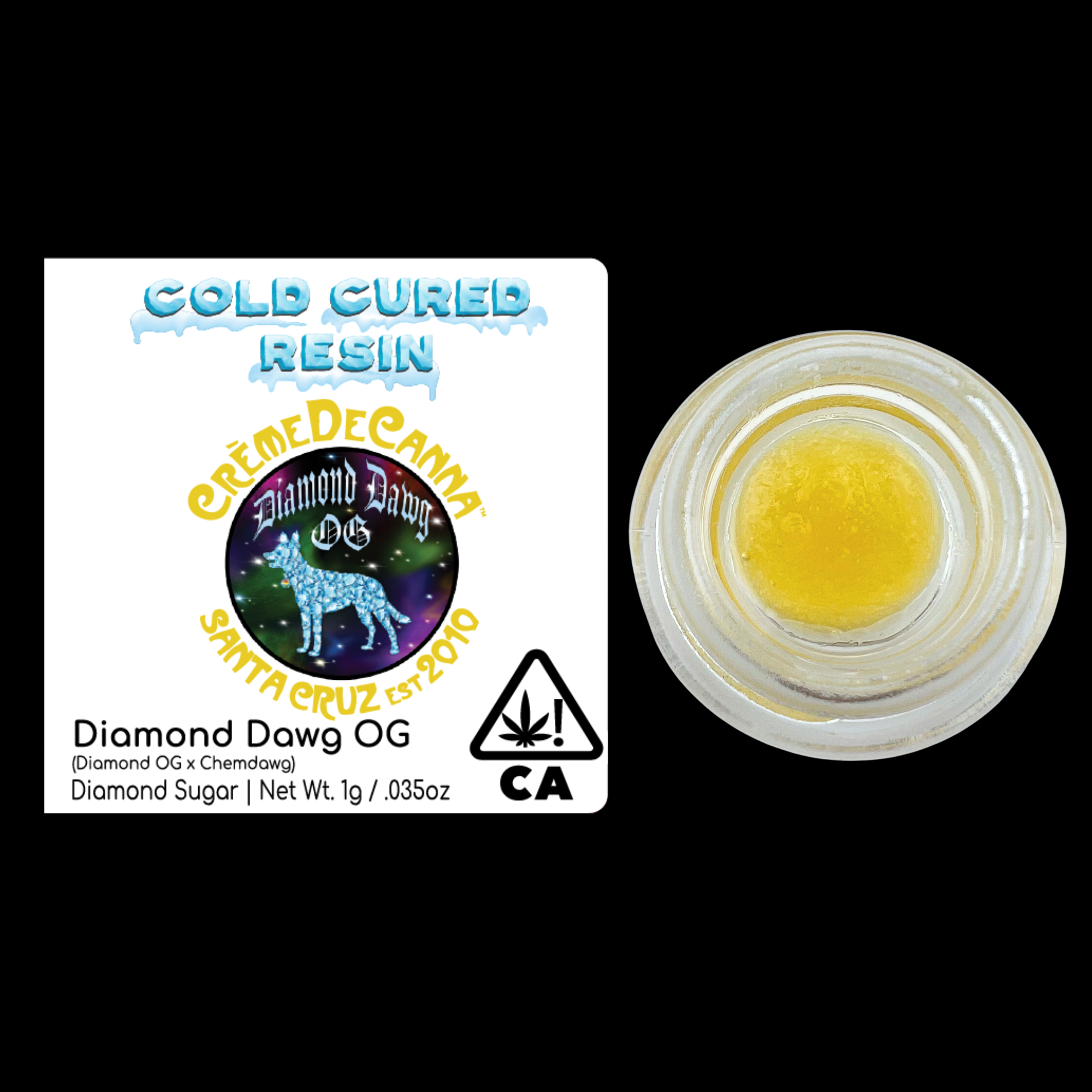 Diamond Dawg OG by Creme De Canna is a cold cured resin diamond sugar crafted to preserve peak terpene expression and potency. Using a meticulous cold extraction and storage process, this concentrate delivers bold flavor and a smooth, terpene-rich experience.