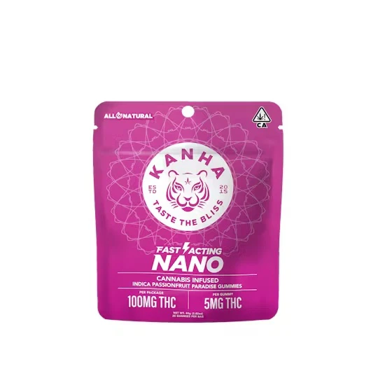 Kanha Nano Passionfruit Paradise Gummies bring exotic tropical flavor and soothing indica effects together in a microdosing-friendly format. Each gummy contains 5mg THC, making it easy to customize your dose or enjoy a light, balanced high. With 20 gummies per pouch, you get 100mg total THC infused with premium indica oil and terpenes like myrcene and α-humulene. Powered by Kanha’s exclusive nano-emulsification technology, these gummies offer faster absorption and a quicker onset (5–15 minutes), delivering a smooth, relaxing experience in record time. Bursting with bright passionfruit flavor, they’re a refreshing way to unwind and a perfect option for both new consumers and seasoned cannabis enthusiasts looking to fine-tune their dose.