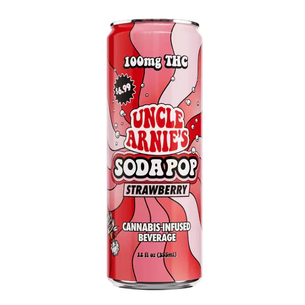 Berry-bubbly 100mg THC strawberry soda—sweet, tart, and fizzy fun in every sip.