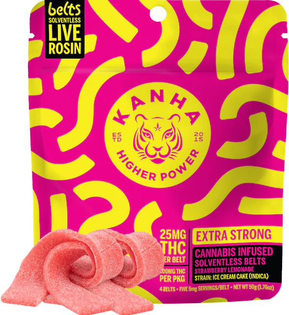 Kanha Strawberry Lemonade Solventless Rosin Belts are crafted for kick-back connoisseurs who crave big flavor and strong indica effects. Each belt packs 25mg THC infused with solventless live rosin from the relaxing Ice Cream Cake strain, delivering terp-rich full-spectrum potency. With 100mg THC per pouch and Kanha’s fast-acting nano technology, these belts hit quickly, easing stress and tension while promoting deep relaxation and euphoric calm. Bursting with sweet strawberry and zesty lemonade flavor, they’re as enjoyable as they are effective—perfect for winding down in the evening or preparing for restful sleep.