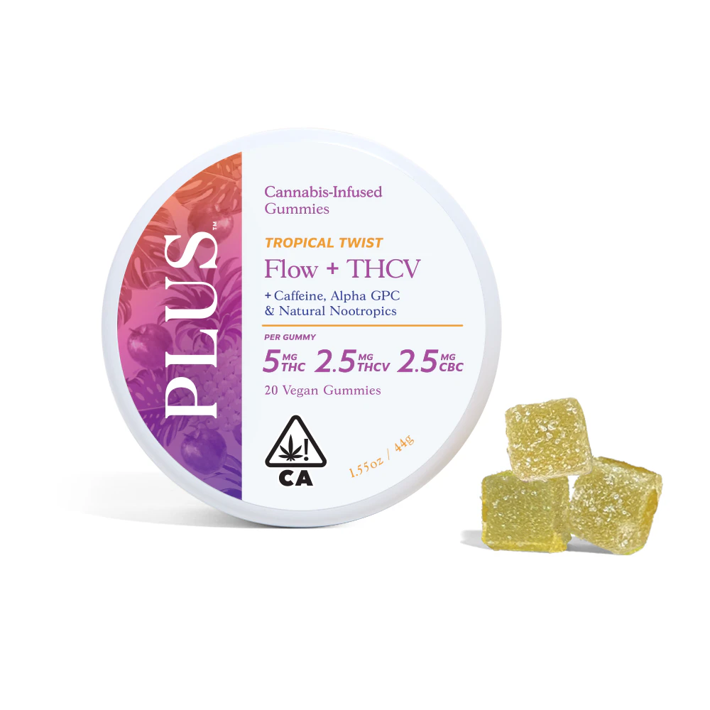 PLUS Flow Tropical Twist Gummies are crafted for active, productivity-focused cannabis users who want to stay sharp and inspired throughout the day. Each gummy blends live rosin cannabis with a targeted cannabinoid ratio of 2:1:1 THC, THCV, and CBC designed to support clarity, energy, and creative momentum.