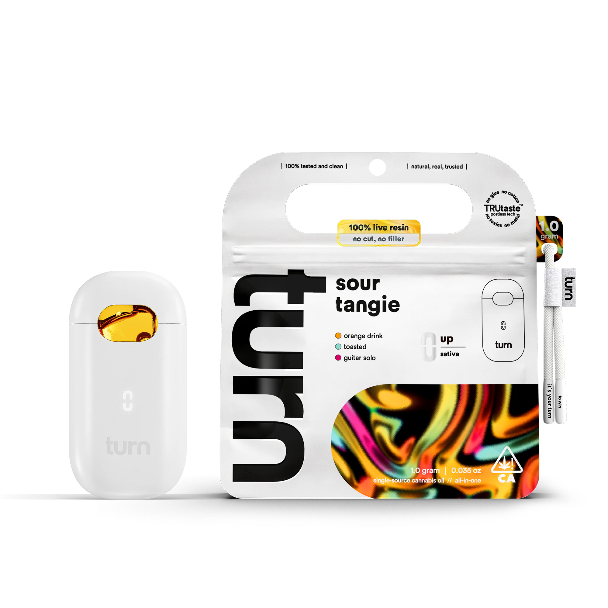 Sour Tangie by Turn is a live resin all-in-one vape delivering a burst of bright, citrus-forward flavor with intense orange sweetness and a tangy finish. This fan-favorite sativa from DNA Genetics blends Sour Diesel and Tangie into a lively, terpene-rich experience.