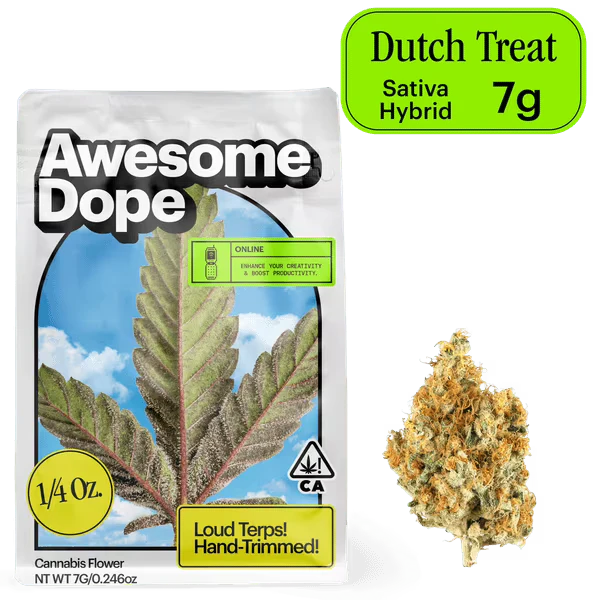 Dutch Treat by Awesome Dope is a classic sativa known for its bright haze terpene profile featuring pine, citrus, and subtle spice. This Amsterdam staple produces dense, light green buds and delivers a clear, energetic head high that boosts mood and focus without weighing down the body—making it a great choice for daytime use or staying productive.