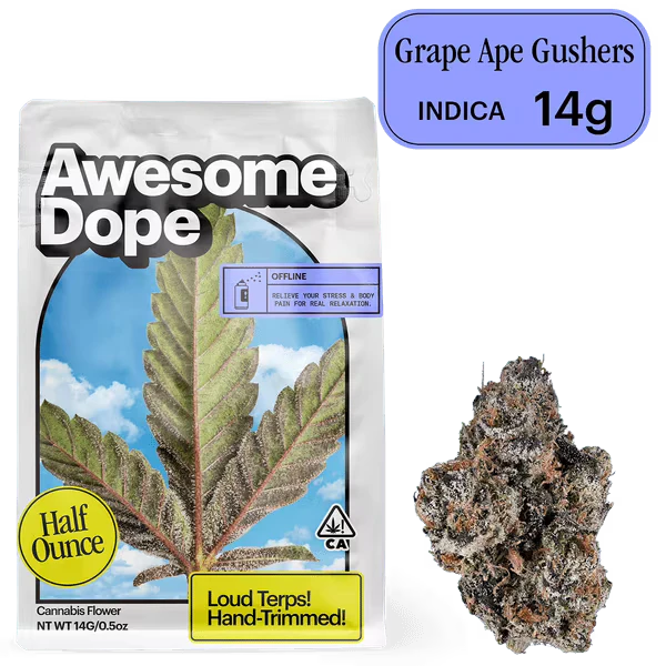 Grape Ape Gushers by Awesome Dope is a bold indica that blends classic purple terpene profiles with modern potency. Expect rich grape-forward flavor layered with fruity sweetness and a strong backbone of gas, thanks to its Gushers lineage and Triangle Kush influence. This cultivar delivers a deeply relaxing, full-bodied experience with standout flavor from start to finish.