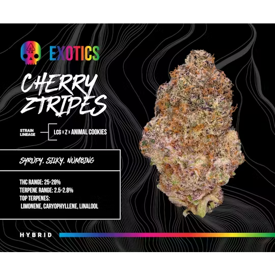 The aroma opens with a candy-like blend of sweet cherry, bright citrus, and ripe berries, translating into a smooth, flavorful smoke. Effects settle in as a deeply relaxing body calm paired with an uplifting, euphoric buzz that keeps the mind engaged and creativity flowing. Cherry Ztripez is an ideal choice for melting away stress while staying inspired and present.