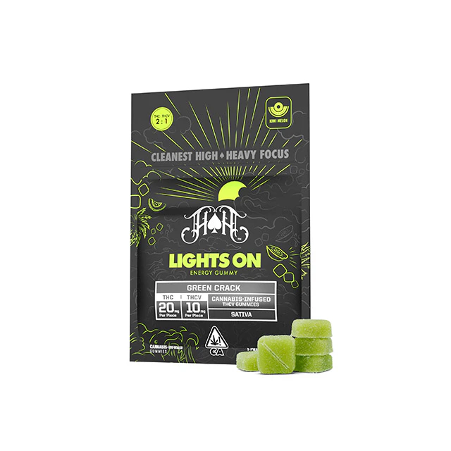 The Heavy Hitters Green Crack THCV Gummy is designed to be a lean, mean, green machine, ready to get you high and hyped, without the hunger. Green Crack, also known as “Green Crush”, is a potent, uplifting super-sativa, descended from the storied Skunk #1 strain, and a still unknown landrace indica. With a kiwi and melon forward flavor, and amped with a bold 2:1 ratio of THC and energizing THCv, these gummies pack 30mg of total cannabinoids per piece, enough to get you flying high and ready to seize the day, minus the munchies.
